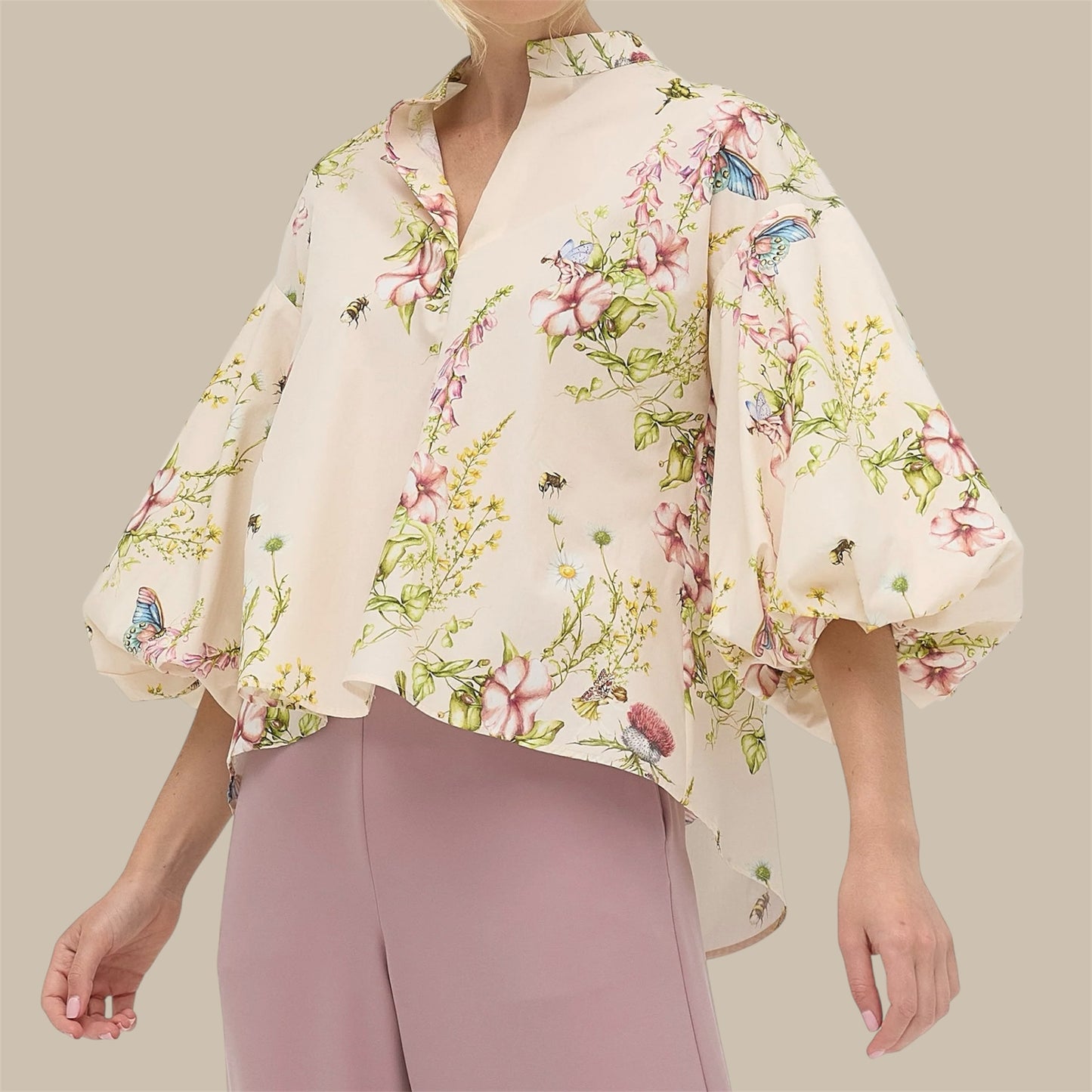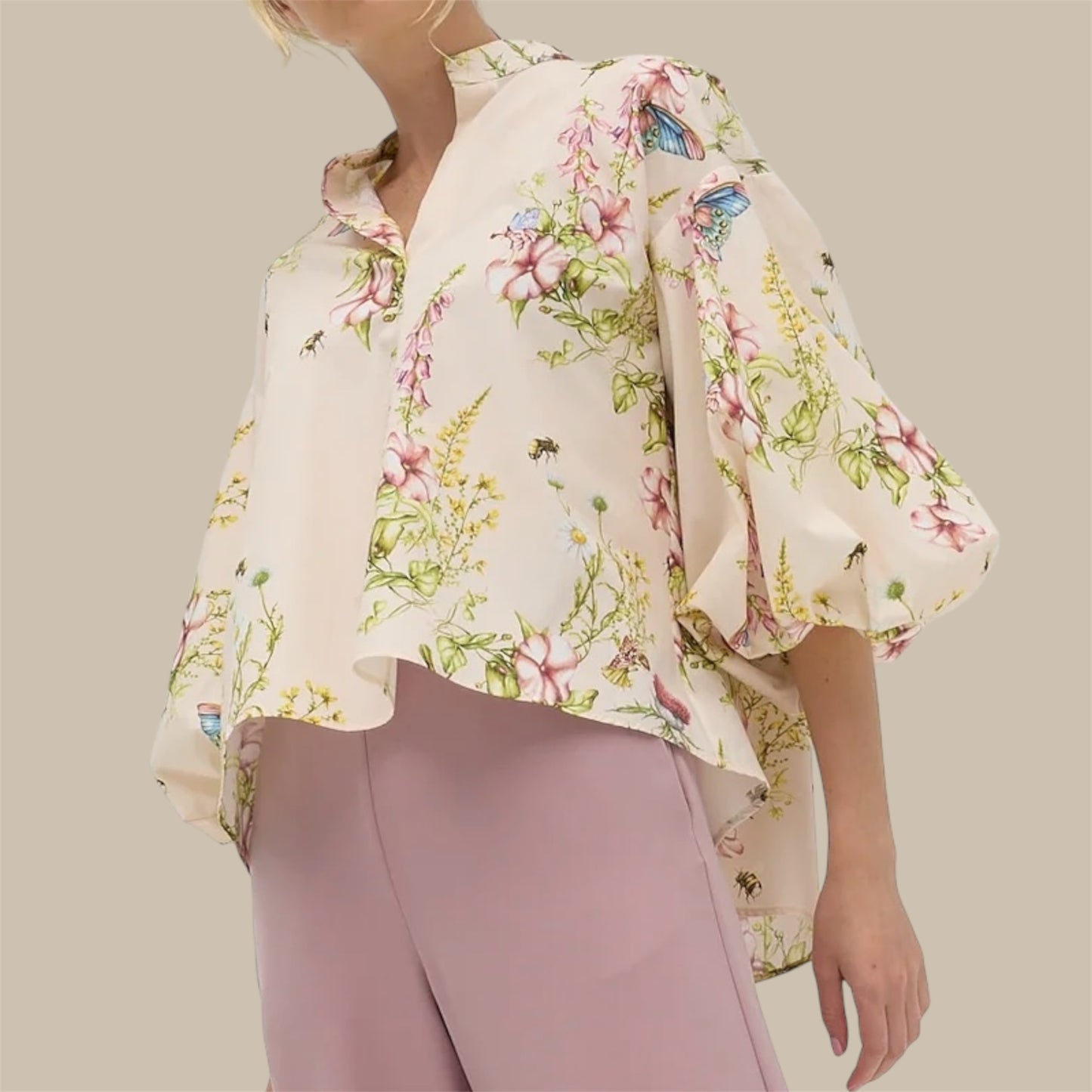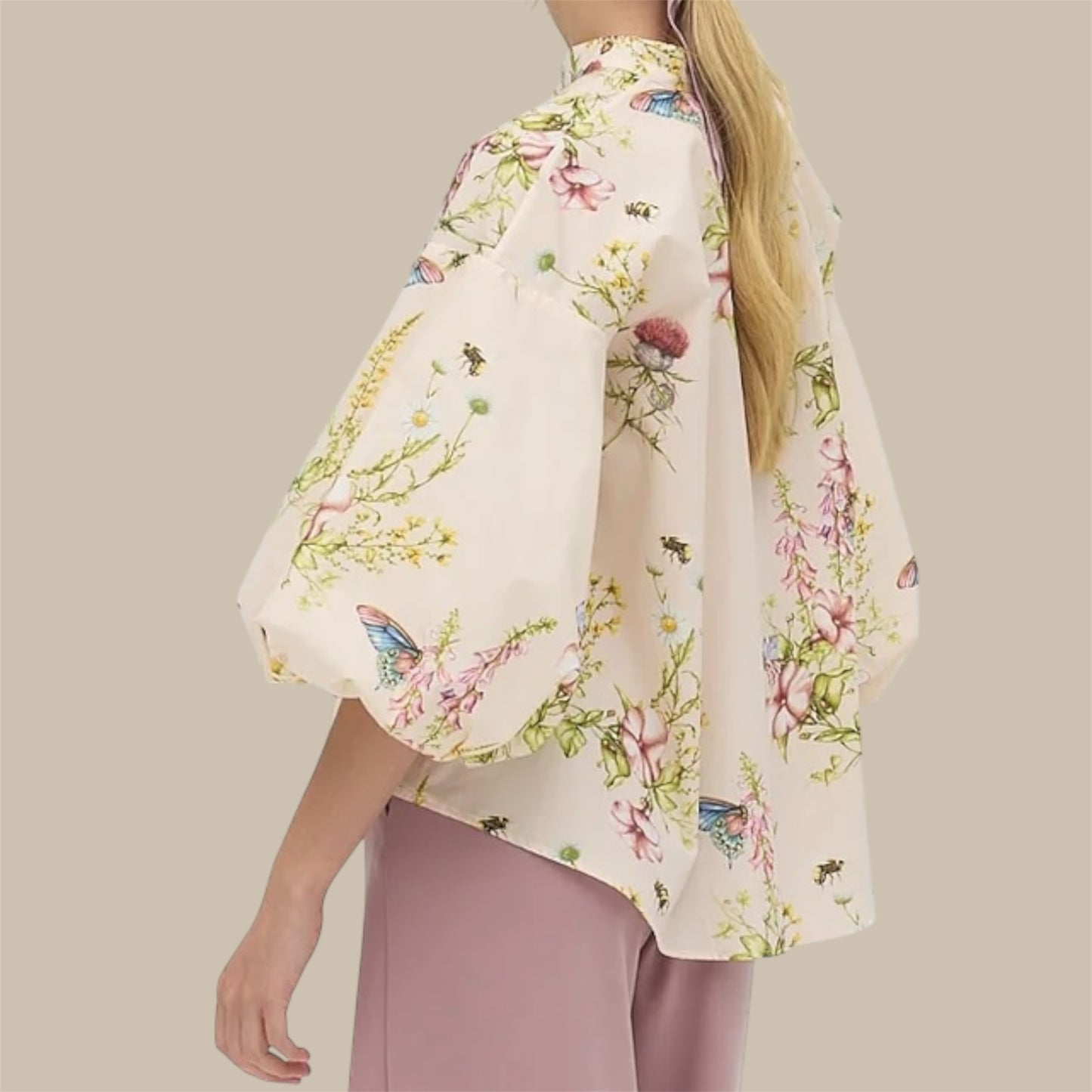 Entdecke das Must-Have der Saison: das übergroße Baumwollhemd Renata mit Mandarinenkragen, elegantem V-Ausschnitt, raffinierter überlappender Vorderseite und stilvollen Ballonärmeln – eine perfekte Balance aus Komfort und zeitloser Eleganz