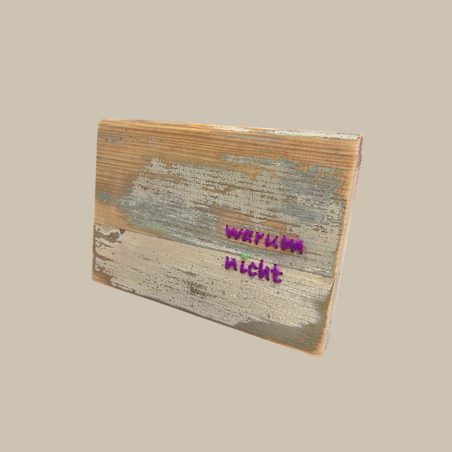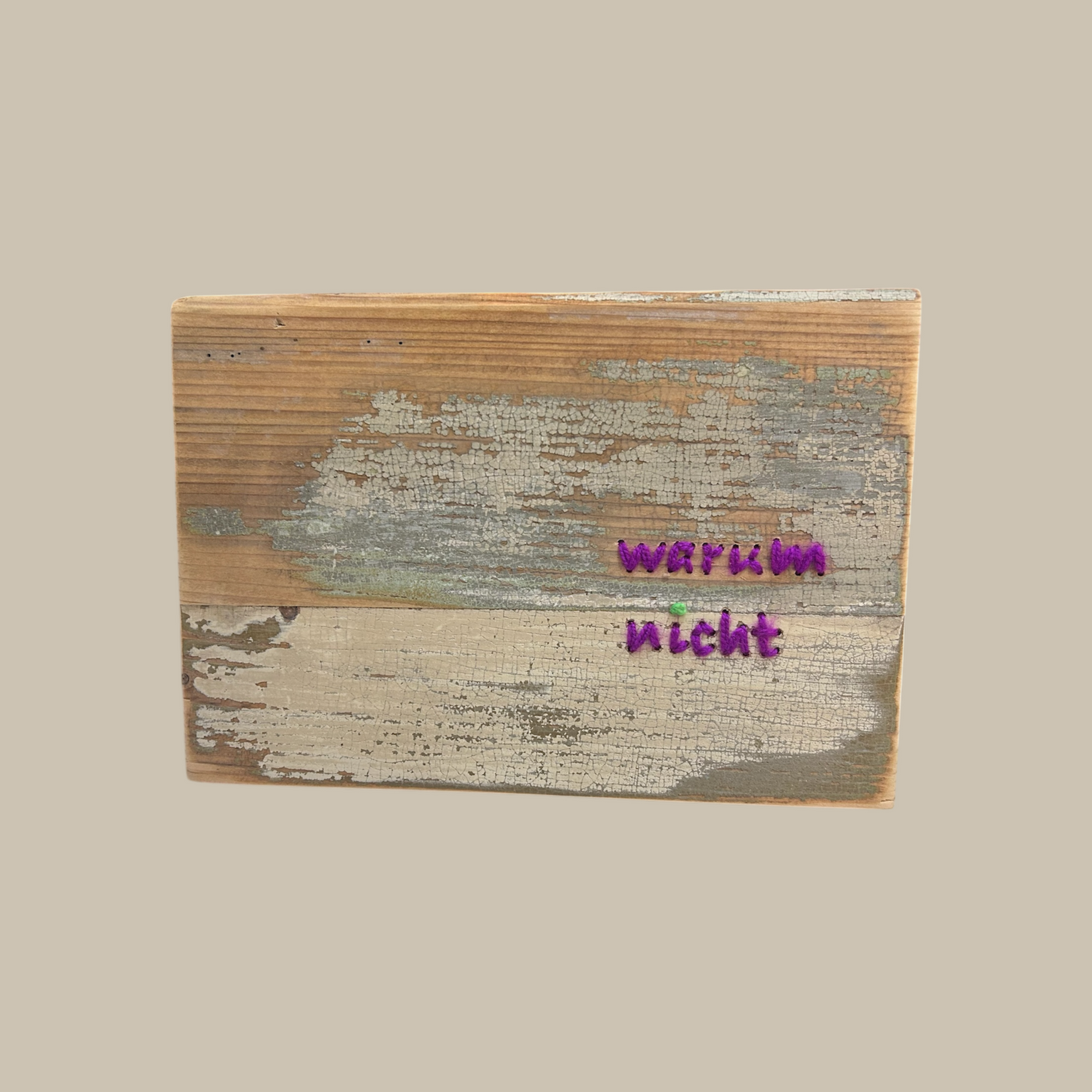 Die Zitate werden liebevoll mit Garnen bestickt, wodurch jedes Schild zu einem unverwechselbaren Kunstwerk wird.